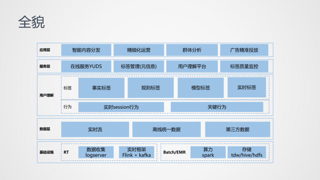 这里不再细讲,在后面会展开一下。以上,就是我们用户画像系统的全貌,下面再详细为大家介绍下: