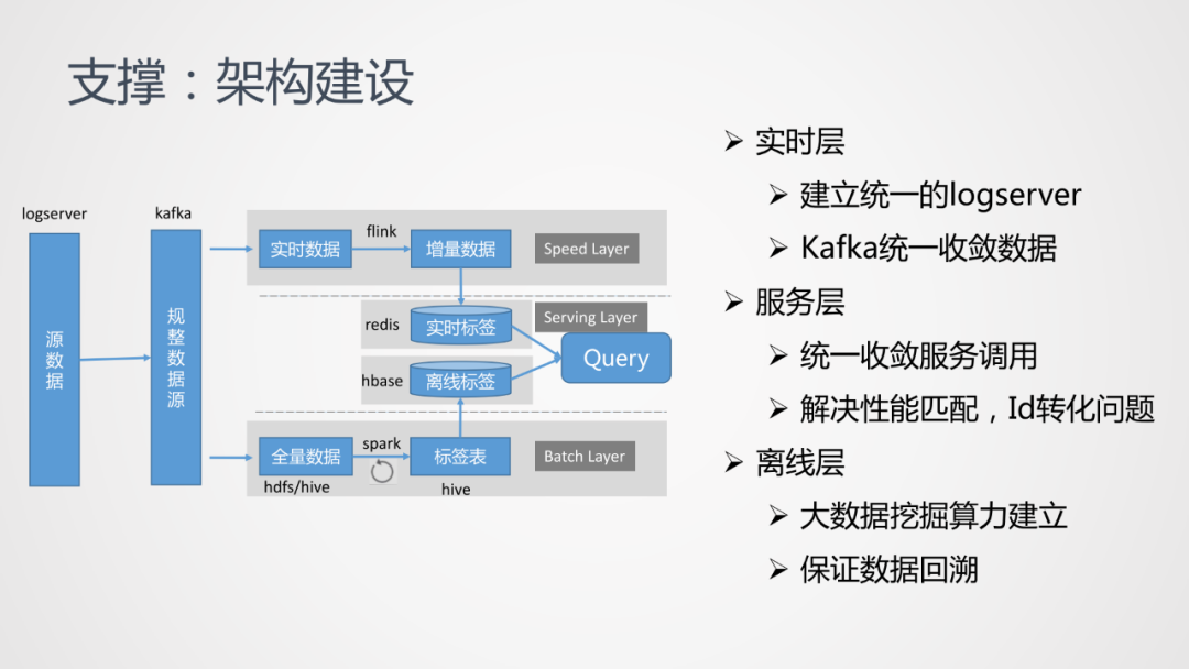 离线层:我们希望有离线的大数据挖掘能力,因为在线时,发现很多模型类的标签没办法通过在线直接挖掘来。另外,我们希望保证数据回溯。有时标签会改掉一些定义或者手段,我们希望对所有的数据进行重刷,这时在开发架构中,重刷会遇到很大困难,但在Lambda架构,可以比较方便的做整体的重刷。