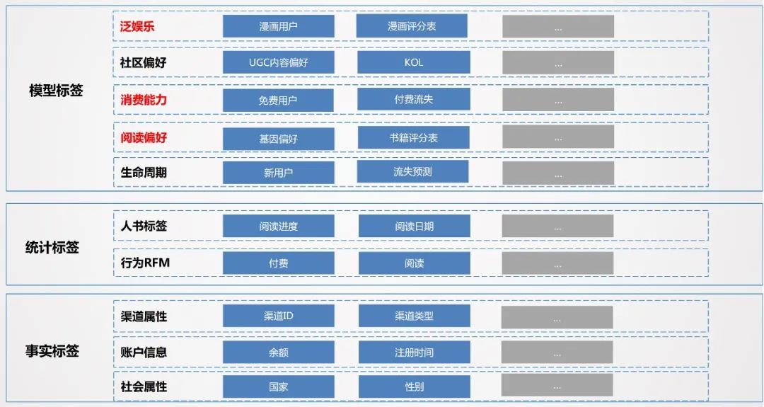 付费阅读偏好:是消费能力的一些积累。后面还有一些泛娱乐的标签,是因为我们的内容形态不仅有网文还有漫画等。