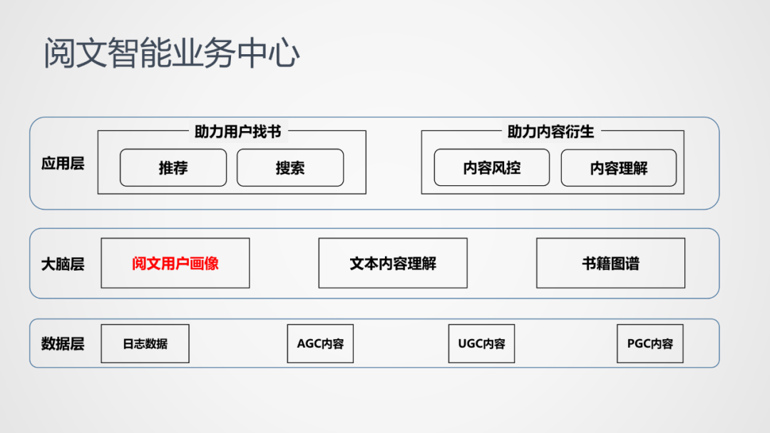 阅文智能业务中心的整体架构主要分为:数据层、大脑层和应用层。