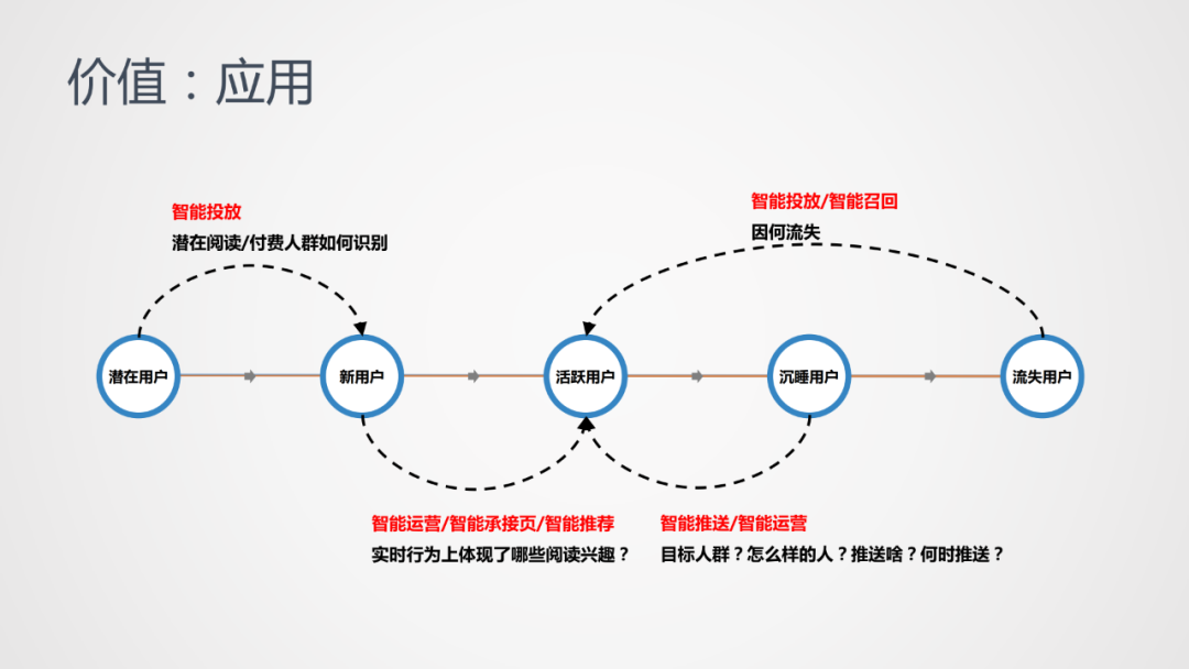 用户画像的应用价值在哪里?我们通过整体的用户生命周期就可以很容易看出用户画像的价值。从潜在用户到新用户,可以识别潜在阅读/付费人群,来进行智能投放;从新用户到活跃用户,可以通过实时行为看出用户的阅读兴趣,来进行智能运营、智能承接页、智能推荐等;还包括未来的流失召回,以及自己用户的激活都跟用户画像息息相关。