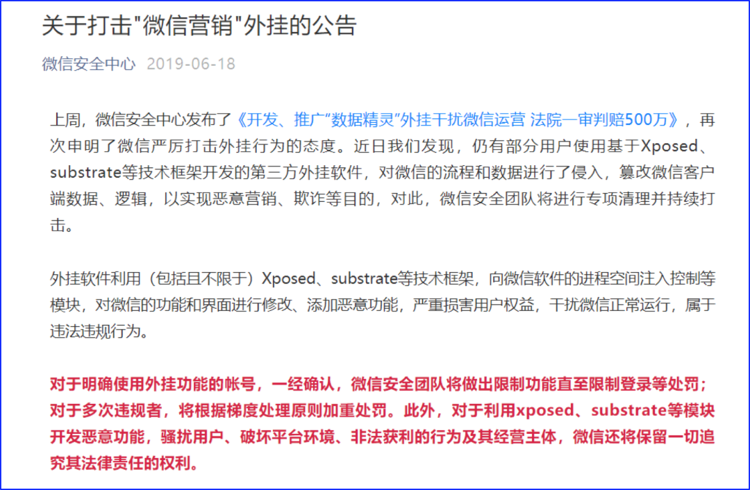 2019年6月18日,微信安全中心发布《关于打击"微信营销"外挂的公告》,称微信发现,有部分用户使用基于Xposed、substrate等技术框架开发的第三方外挂软件,实现暴力加粉、消息一键群发推送、自动回复机器人、全球虚拟定位、微信群自动推广、微信号批量增删好友等功能。