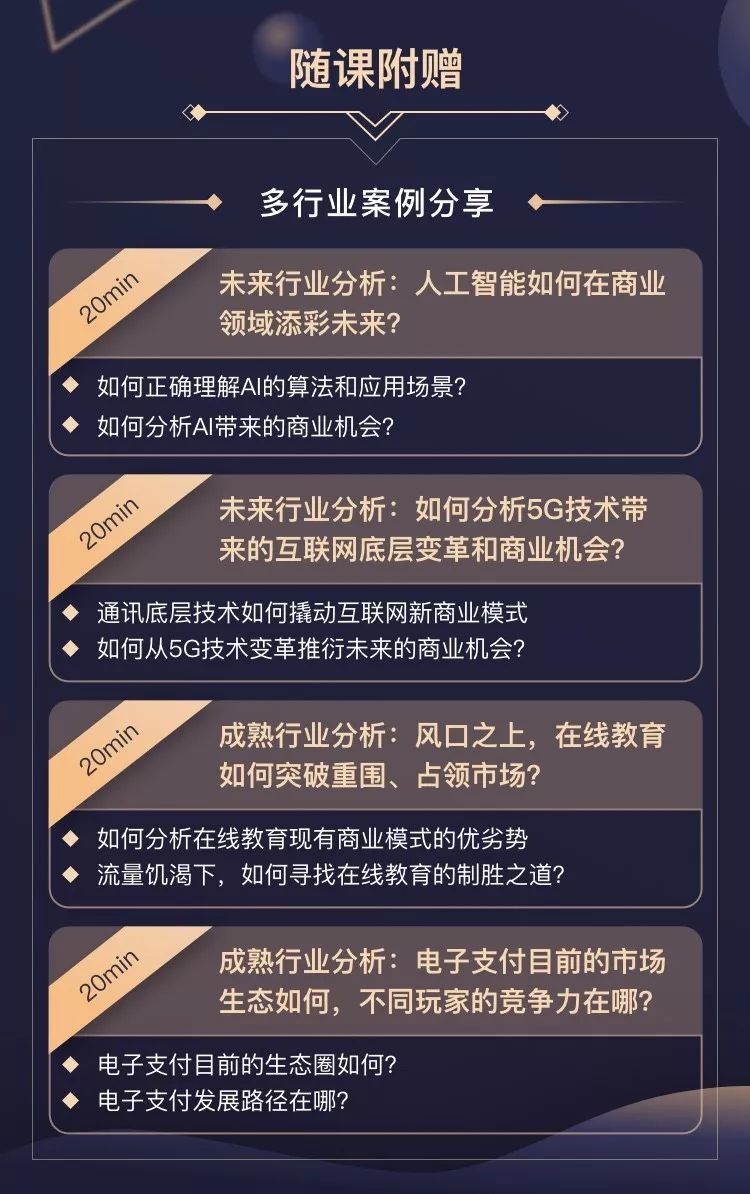 三位前麦肯锡人领衔授课,还有来自腾讯的商业分析师重磅加盟,无保留为你分享业内高水平商业分析工作过程。