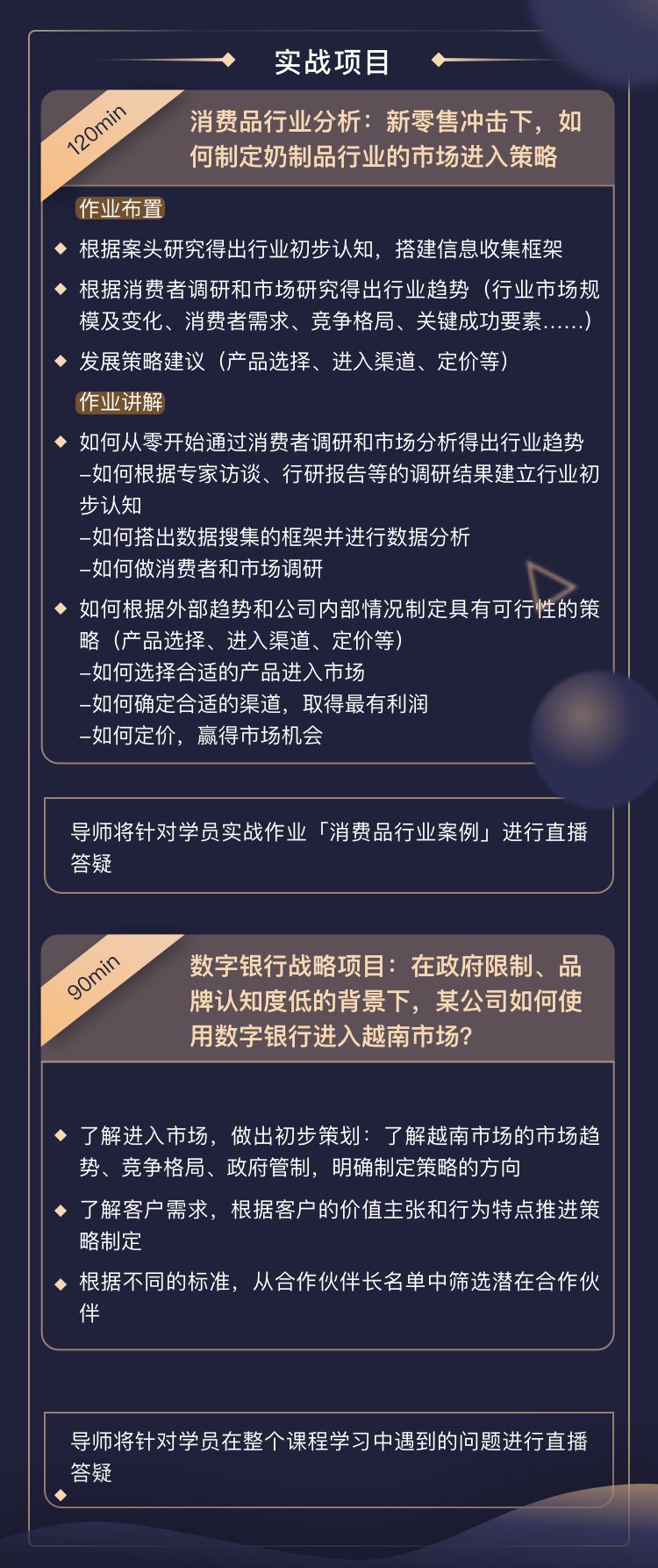 在真实的工作场景下,手把手教授数据搜集和整理、行业分析、市场规模预测、PPT等必备的商业技能;
