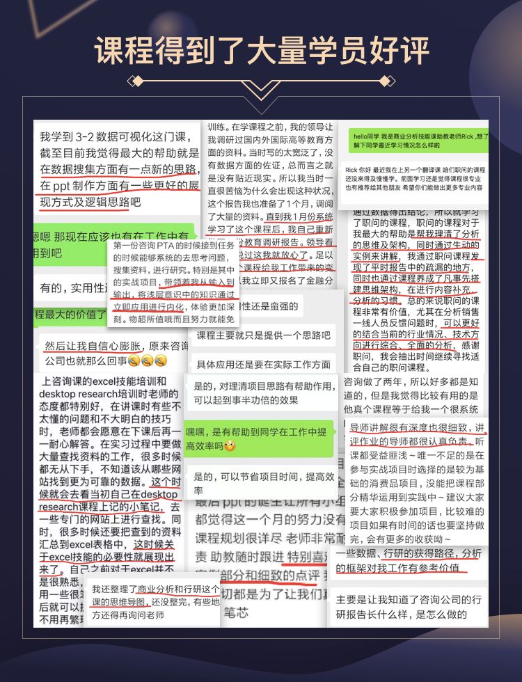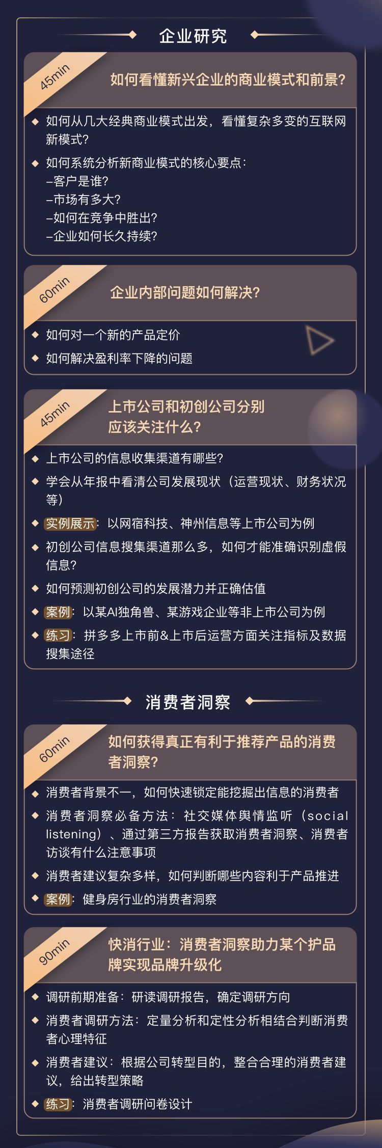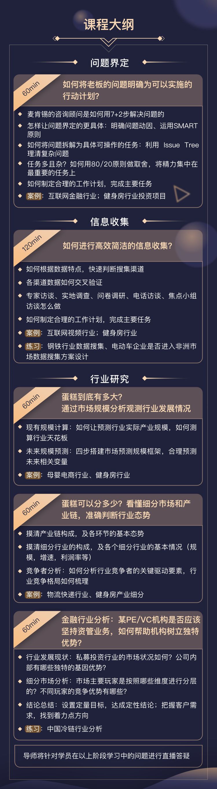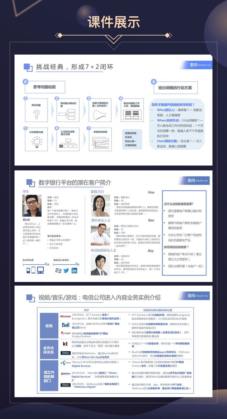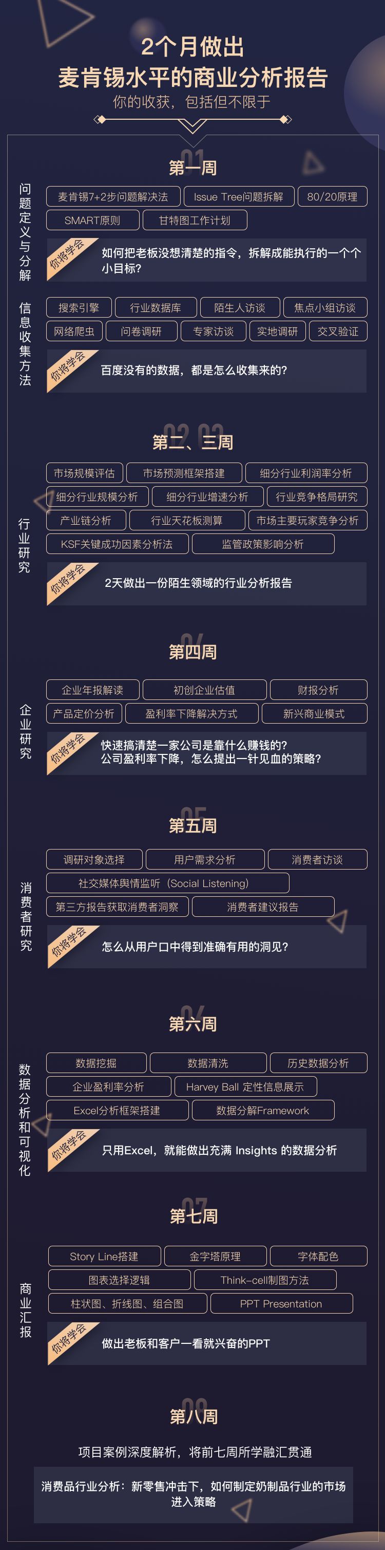 课程设计逻辑是「一个商业问题的界定-分析-汇报」,完整涵盖顶级商业分析师的工作流程,既有数据搜集、行业研究、企业研究、消费者研究,也有Excel数据分析,PPT制作。