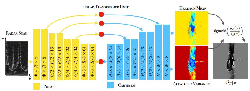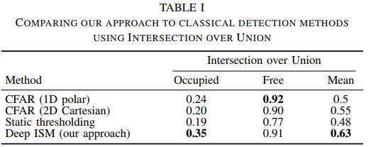 为了解决这个问题,我们提出了学习逆向传感器模型(ISM),使用深度神经网络将原始雷达扫描转换为占用概率栅格地图。我们的网络使用激光雷达生成的部分占用标签进行自我监督,它允许机器人从过去的经验中学习世界的占用情况,而无需人工监督。我们通过在动态城市环境中记录的五小时的数据来评估我们的方法。通过考虑每个栅格单元的场景上下文,我们的模型优于标准的CFAR滤波方法,能够成功地将世界划分为占用的和空闲的空间。此外,通过将异方差不确定性纳入我们的模型公式,我们能够量化整个传感器观察中不确定性的方差。通过这种机制,我们能够成功地识别可能被遮挡的空间区域。