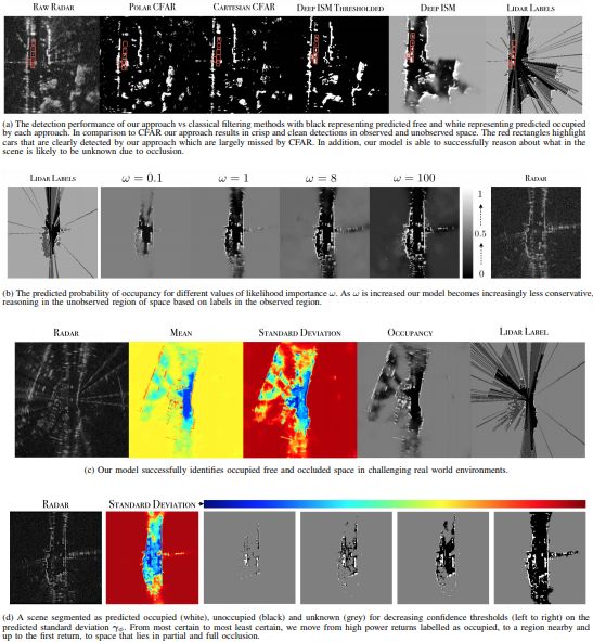 图4 a)本文方法与经典的滤波方法CFAR的检测性能比较(黑色代表预测的自由空间,白色代表预测的占用空间);b)对于不同似然重要性值ω的预测占用概率。随着ω的增加,我们的模型变得越来越不保守;c)本文模型在具有挑战性的真实世界环境中成功地识别出了占用的空间和封闭的空间;d)在预测的标准偏差γφ上(从左到右)减小置信度阈值的场景被分割为预测占用(白色),未占用(黑色)和未知(灰色)区域。