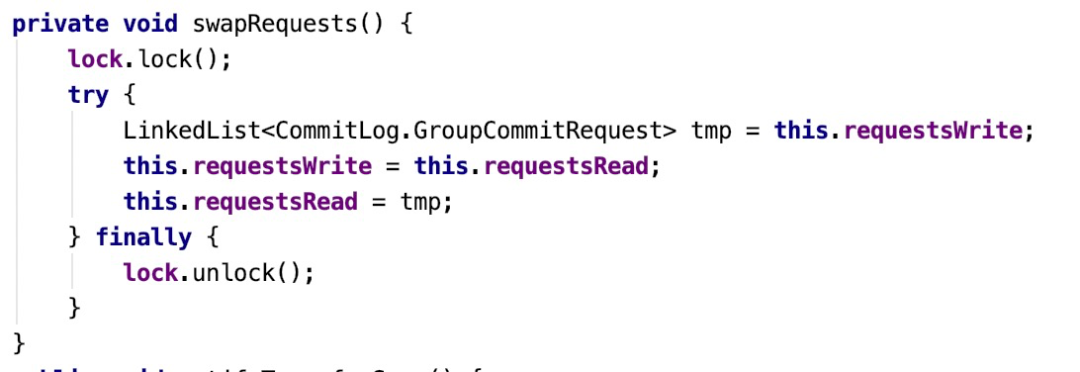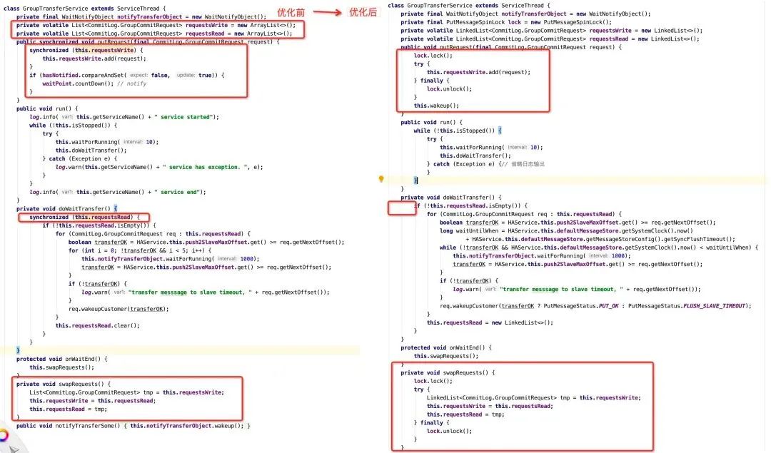 doWaitTransfer方法操作的主要对象是requestRead链表,而且该方法只会被GroupTransferService线程调用,并且requestRead中方法会在swapRequest中被修改,但这两个方法是串行执行,而且在同一个线程中,故无需引入锁,该锁可以移除。