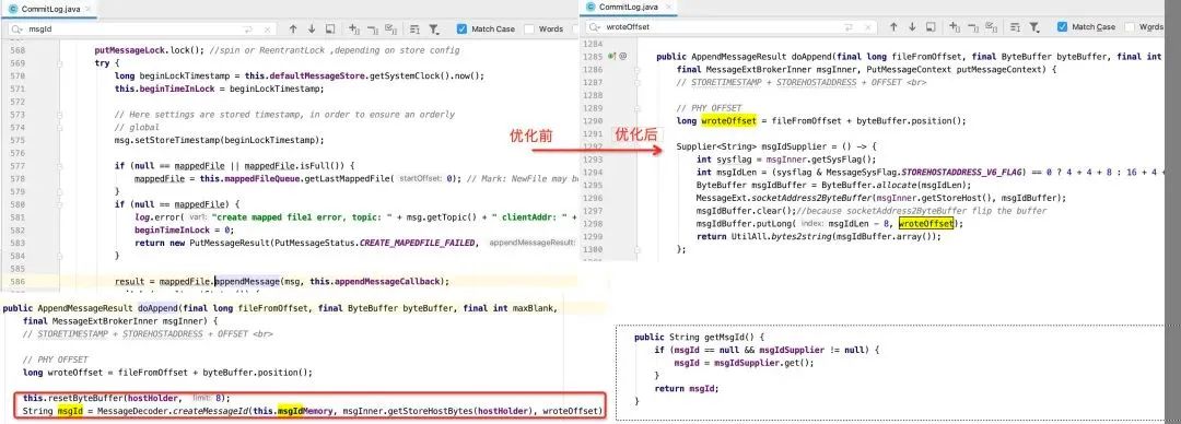 新版本采用函数式编程的思路,只是定义来获取msgId的方法,在进行消息写入时并不会执行,降低锁的粒度,使得offsetMsgId的生成并行化,其编程手段之巧妙,值得我们学习。