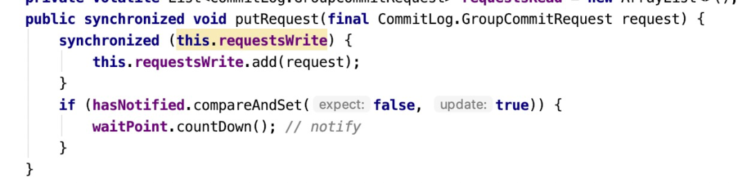 RocketMQ主节点将消息写入内存后, 如果采用同步复制,需要等待从节点成功写入后才能向消息发送客户端返回成功,在代码编写方面也极具技巧性,时许图如下图所示: