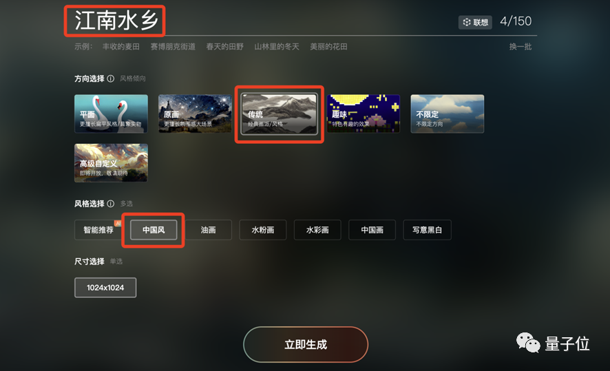 相比之下,文心·一格的操作只需三个步骤:输入文字,鼠标选择风格&尺寸,点击生成。