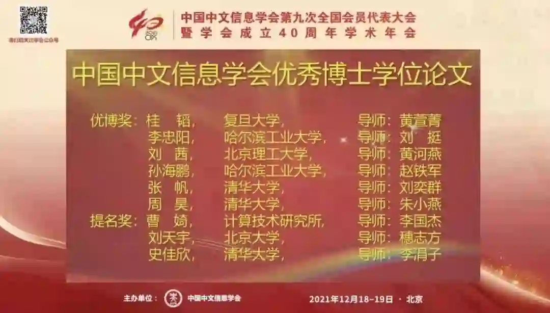 中国中文信息学会公布了2021年中国中文信息学会优秀博士学位论文获奖名单。该评选工作于今年5月启动。经过材料申报、格式审查、专家初审、初审公示及专家终审会,共评出6人获得2021年中国中文信息学会“优秀博士学位论文奖”,3人获得“优秀博士学位论文”提名奖。