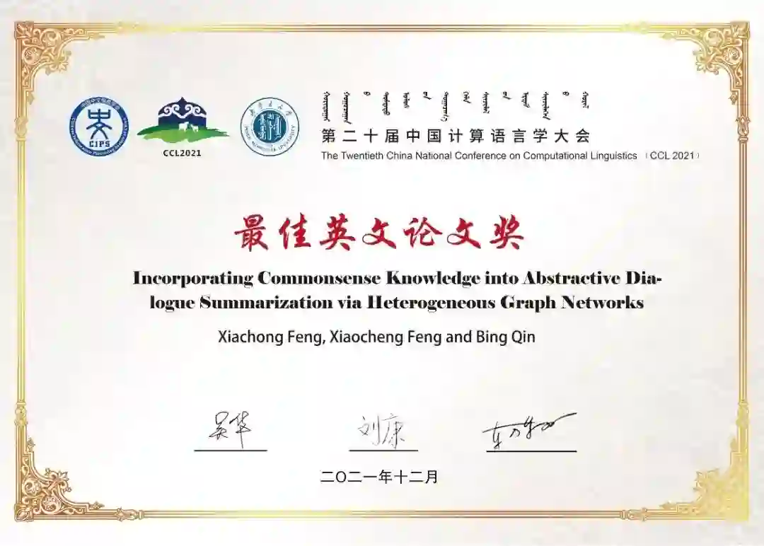中国计算语言学大会(The China National Conference on Computational Linguistics, CCL)创办于1991年,是中国中文信息学会(CIPS)的旗舰会议。在刚刚结束的第二十届中国计算语言学大会(CCL 2021)中,哈工大社会计算与信息检索研究中心(SCIR)论文Incorporating Commonsense Knowledge into Abstractive Dialogue Summarization via Heterogeneous Graph Networks荣获最佳英文论文奖,作者为冯夏冲博士生,冯骁骋副教授,秦兵教授。