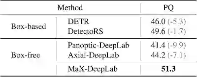 我们首次证明了全景分割可以进行端到端训练。MaX-DeepLab 使用遮罩 Transformer 直接预测遮罩和类,消除了手工设计对于经验的依赖,如对象边界框、thing-stuff(thing 类物体和 stuff 类物体)合并等。借助 PQ 式损失函数和双路径 Transformer,MaX-DeepLab 在极具挑战性的 COCO 数据集上取得了最高水准的结果,消除了有边界框方法和无边界框方法之间的差距。