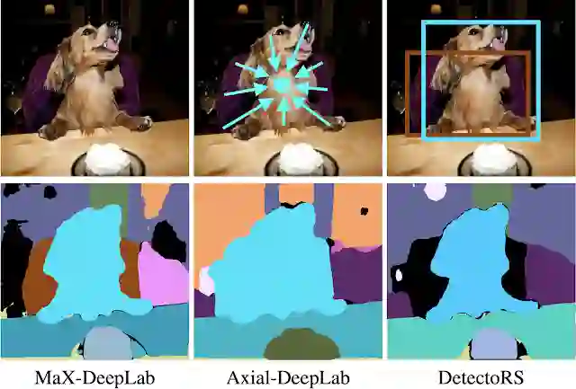 如下图所示,MaX-DeepLab 正确地分割了一只坐在椅子上的狗。Axial-DeepLab 依赖于回归对象中心偏移量的代理任务。它之所以失败,是因为狗和椅子的中心太过于接近。作为代理任务,DetectoRS 会将对象的边界框而非遮罩进行分类。由于椅子的边界框置信度较低,所以就被滤除了。