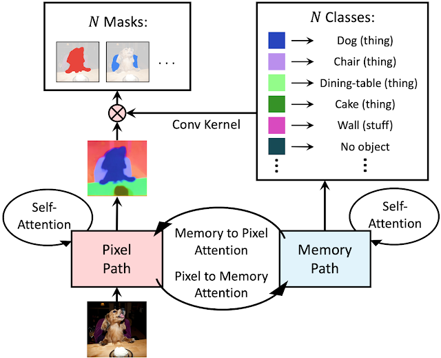 在《MaX-DeepLab:利用遮罩 Transformer 实现端到端全景分割 (MaX-DeepLab: End-to-End Panoptic Segmentation with Mask Transformers)》(将提交给 CVPR 2021 大会)一文中,我们首次为全景分割管线提出了完全的端到端方法——将 Transformer 架构扩展到此计算机视觉任务中,直接预测具有类标签的遮罩。这种方法叫做 MaX-DeepLab,利用 Mask Xformer 对 Axial-DeepLab 进行扩展。该方法采用双路径架构,引入了全局内存路径,允许与任何卷积层直接通信。MaX-DeepLab 最终在极具挑战的 COCO 数据集上以及无边界框的状态下实现了 7.1% 的显著全景质量 (PQ) 增益,首次消除了有边界框方法和无边界框方法之间的差距。在不增加测试时长的情况下,就 PQ 方面而言,MaX-DeepLab 在 COCO 测试开发集上达到了 51.3% 的水平,这已是目前的最高水准。