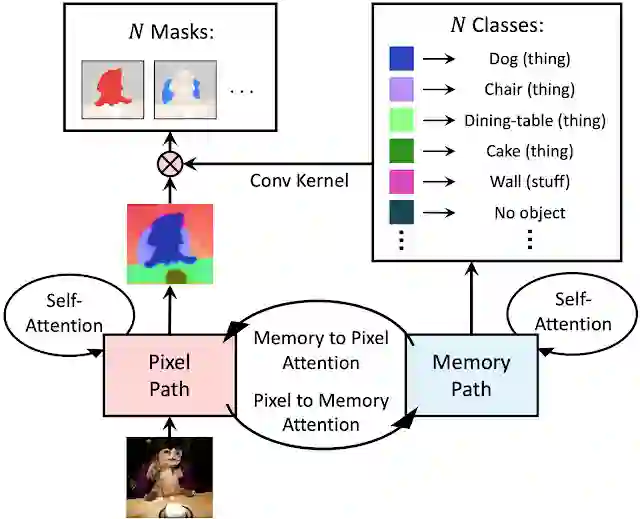 与卷积神经网络 (CNN) 上堆叠传统 Transformer 的方案不同,我们提出了一种结合 CNN 与 Transformer 的双路径框架。具体而言,我们通过一个双路径 Transformer 元件,使 CNN 层能够从全局内存中读写数据。这里所说的这个元件采用了 CNN 路径和内存路径之间的所有四种注意力 (Attention) 类型,可以插入到 CNN 中的任意位置,从而允许在任何层与全局内存通信。MaX-DeepLab 还利用堆叠的沙漏式解码器,可将多种尺度特征聚合成高分辨率输出。然后系统会将该输出与全局内存特征相乘,形成遮罩组预测。至于遮罩类别,则使用另一种 Transformer 进行预测。