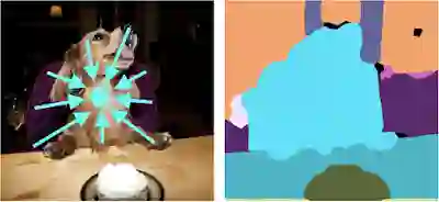 以往提出的 DETR 方法简化边界框检测子任务成端到端操作来解决其中一些问题,事实证明,这种做法的计算效率更高,产生的无关构件也更少。然而,训练过程在很大程度上仍然依赖边界框检测,这显然与基于遮罩的全景分割定义不相符。另一种做法是将边界框从管线中彻底移除,这样做的好处是消除了整个子任务及其相关模块和构件。例如,Axial-DeepLab 预测预定义实例中心的像素偏移量时,如果图像平面中有各种各样的形状,或相邻对象的中心点较为接近,例如下面这张狗狗坐在椅子上的图像,那它所使用的子任务则会遇到对象严重变形的挑战。