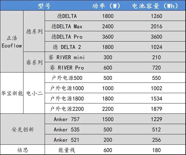 具体来看,以一级市场火热的EcoFlow和德兰明海为例,二者产品多以大功率电源为主,比如EcoFlow推出的德DELTA系列,额定功率在1000wh以上,德DELTA Pro达到了3600wh;而安克创新最新推出的一款757便携式储能产品,其带电容量也达到了1229wh;相对来讲,华宝新能多以小功率电源为主,不过其正在向大功率发力,新推出的产品2000 Pro,可以达到2160Wh容量。