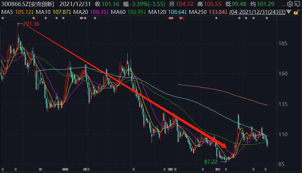 尽管便携储能产品为安克创新带来了新的增长点,但今年其二级市场的表现却不尽人意。2021年全年来看,安克创新的扣非净利润同比减少2.69%,这也是2014年以来的首次下降(注:2014年安克创新在新三板挂牌),且股价也从2021年最高点的201.36跌到了最低点的87.22,跌去了55%以上。