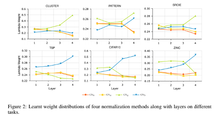 作者在不同任务中尝试了节点式归一化(Node-wise),邻接式归一化(Adjance-wise),图式归一化(Graph-wise)和批处理归一化(Batch-wise)作为归一化计算方式,来分析每种归一化方式的优劣,并提出一种基于学习的四合一自动加权组合的方式来学习适合当前任务的图归一化。