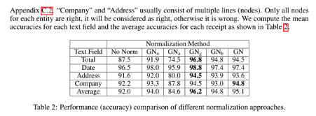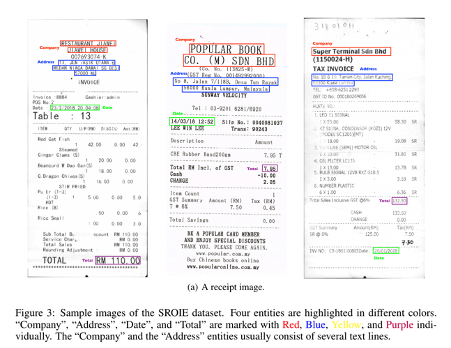 论文除了follow [1]中的实验之外,还做了一个关键信息抽取SROIE的任务,这个任务有四个关键字段,’公司名’、’地址’、’时间’、’合计金额’,如下图所示。论文把关键信息抽取看出是一个节点分类任务,其中’公司名’和’地址’可能包含多行,也就是多个节点,只有当所关键字段包含的所有节点都同时分类正确才算对,否则就算错误。
