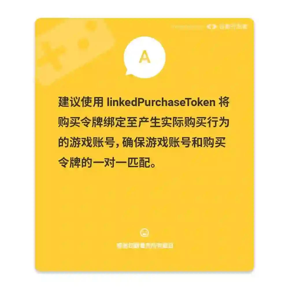 拥有不同游戏账号的几个玩家可能会共享同一个 Google 订阅账号,并利用订阅权益在竞技游戏内获取不公平的优势。为了解决这个问题,我们建议开发者使用 linkedPurchaseToken 将购买令牌绑定至产生实际购买行为的游戏账号,以确保游戏账号和购买令牌的一对一匹配。