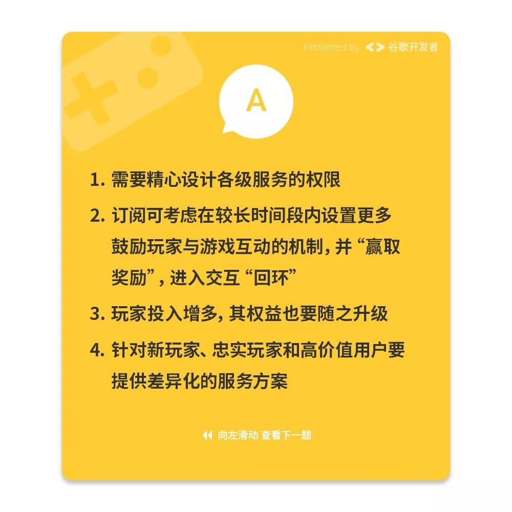 在设计订阅权益时,请将用户成长纳入考量范围,如游戏时间,游戏进度以及 IAP 消费等。