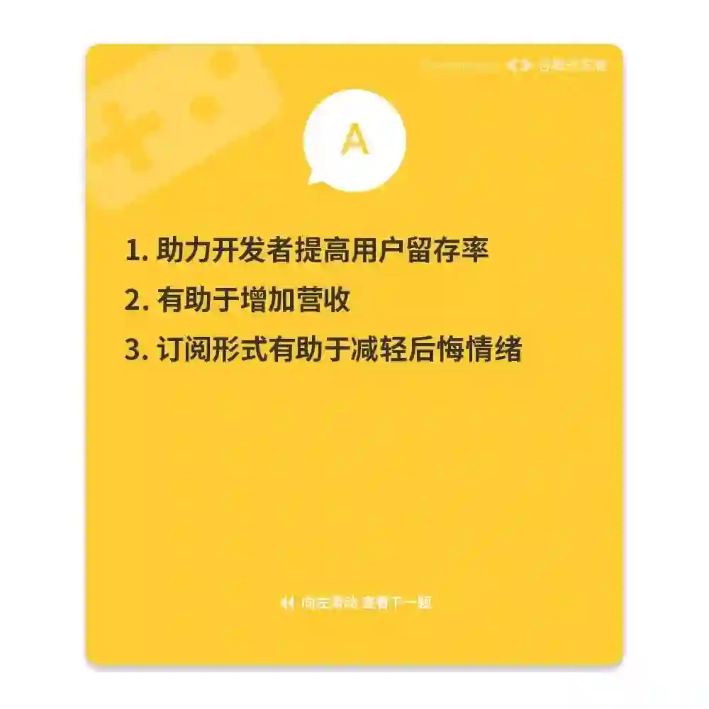 读到这里,可能有读者会觉得惊讶,请允许我稍稍解释一下: 用户大量购买 IAP 项目后常常会感到后悔。但订阅业务则有助于塑造流畅的用户体验,玩家不需要在一天内体验完所有项目,而是在一段时间内慢慢消化,因此也不容易产生后悔情绪。