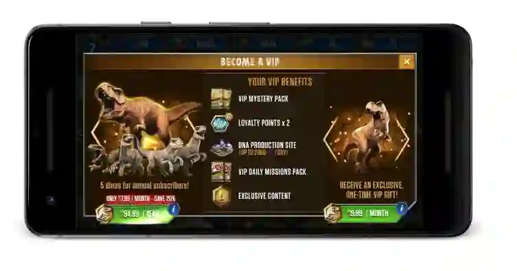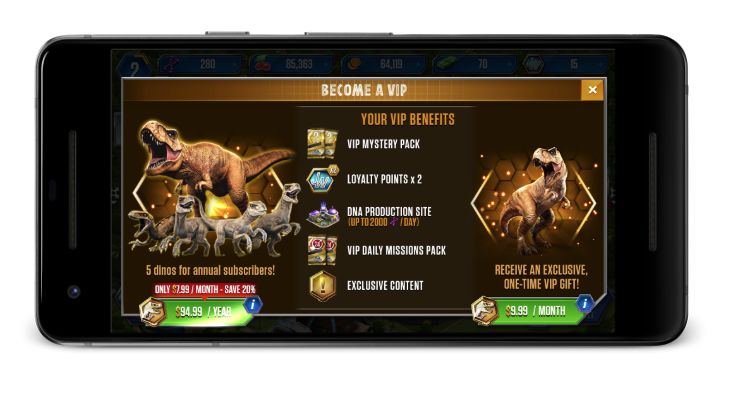 高价值用户是忠诚度计划的主要目标群体,比如说航空公司推出的飞行常客奖励计划。高价值玩家期望享有一流的游戏体验、特权以及奖励作为长期投入的回报。在 Ludia 旗下的动作冒险游戏《侏罗纪世界: 游戏》中,VIP 玩家不仅可获得更多游戏币,还可以参加 VIP 专属联赛,并抢险体验新内容。第一次购买订阅服务的新玩家还可以解锁特殊的永久道具,其性能会随游戏时间的增多而变强。