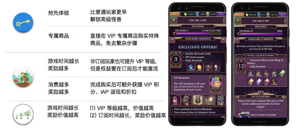 允许非订阅用户积累终生奖励:《传奇》同样也允许非订阅用户提升 VIP 等级。等级越高,奖励的价值越高。由于这些奖励要在订阅后才能被激活,所以普通玩家升至一定等级后,自然而然就会转换成订阅用户。