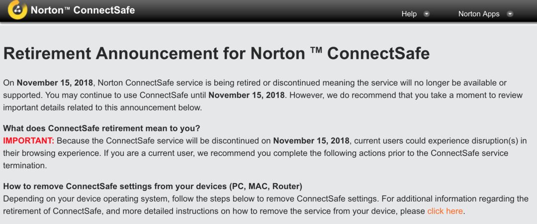 现在,赛门铁克宣布将于 2018 年 11 月 15 日关闭 Norton ConnectSafe 服务,届时使用 Norton ConnectSafe DNS 服务器的设备将无法再连接到 Internet 站点和其它互联网服务。如果有在使用 Norton ConnectSafe 的用户建议尽快更换到其它公共 DNS。