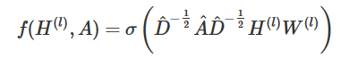• A是没有经过归一化的矩阵,这样与特征矩阵相乘会改变特征原本的分布,产生一些不可预测的问题。所以我们对A做一个标准化处理。首先让A的每一行加起来为1,我们可以乘以一个D的逆,D就是度矩阵。我们可以进一步把D的拆开与A相乘,得到一个对称且归一化的矩阵 :