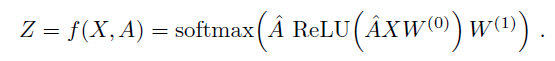 假设我们构造一个两层的GCN,激活函数分别采用ReLU和Softmax,则整体的正向传播的公式为: