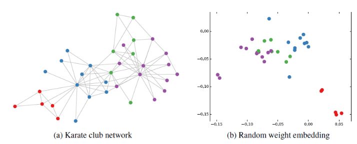 然后作者做了一个实验,使用一个俱乐部会员的关系网络,使用随机初始化的GCN进行特征提取,得到各个node的embedding,然后可视化: