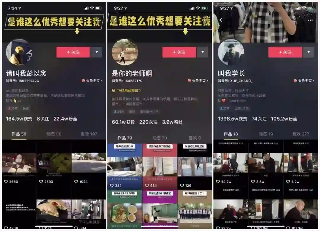 反而是抖音平台上的头部Vlogger几乎都是普通人,如「请叫我彭以念」是一位多次创业失败,如今作为外卖骑手,用Vlog记录自己的送餐日常的小姐姐;专注于记录班主任日常教学工作生活的「是你的老师啊」;「琪琪弗」则是一位23岁患上白血病,记录自己治疗过程的心情和生活的姑娘;用Vlog记录爷爷奶奶相伴70年爱情故事,收获200多万人点赞的「叫我学长」等等。