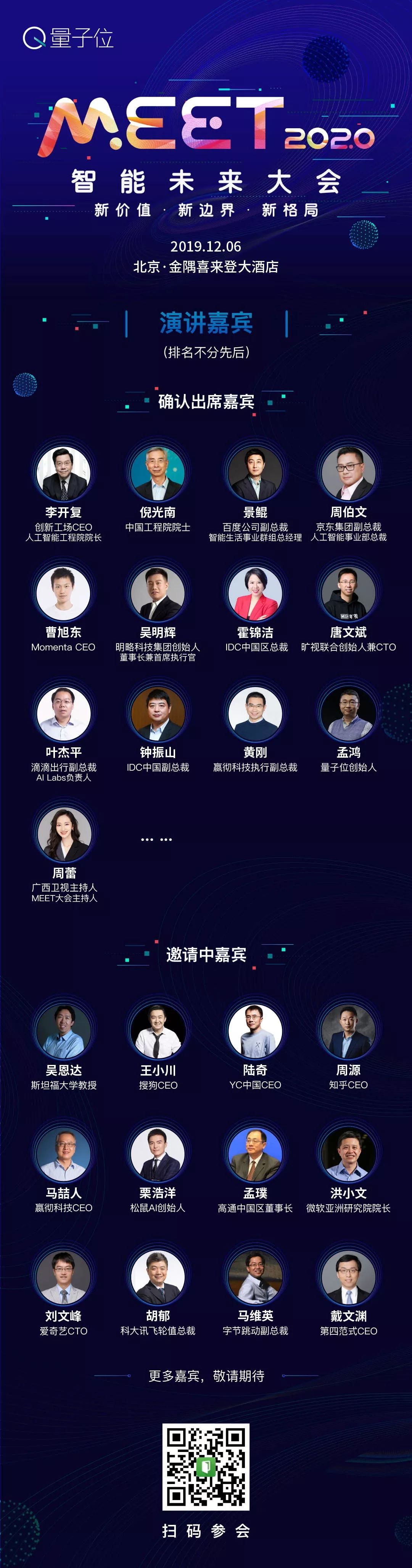 量子位 MEET 2020 智能未来大会启幕,李开复、倪光南、景鲲、周伯文、吴明辉、曹旭东、叶杰平、黄刚等AI大咖与你一起读懂人工智能。观众票即将售罄,扫码报名预定席位 ~