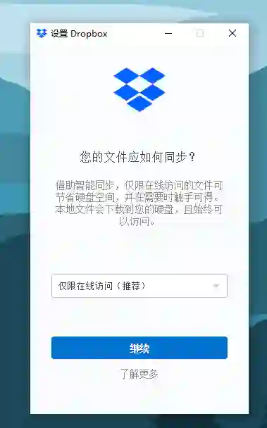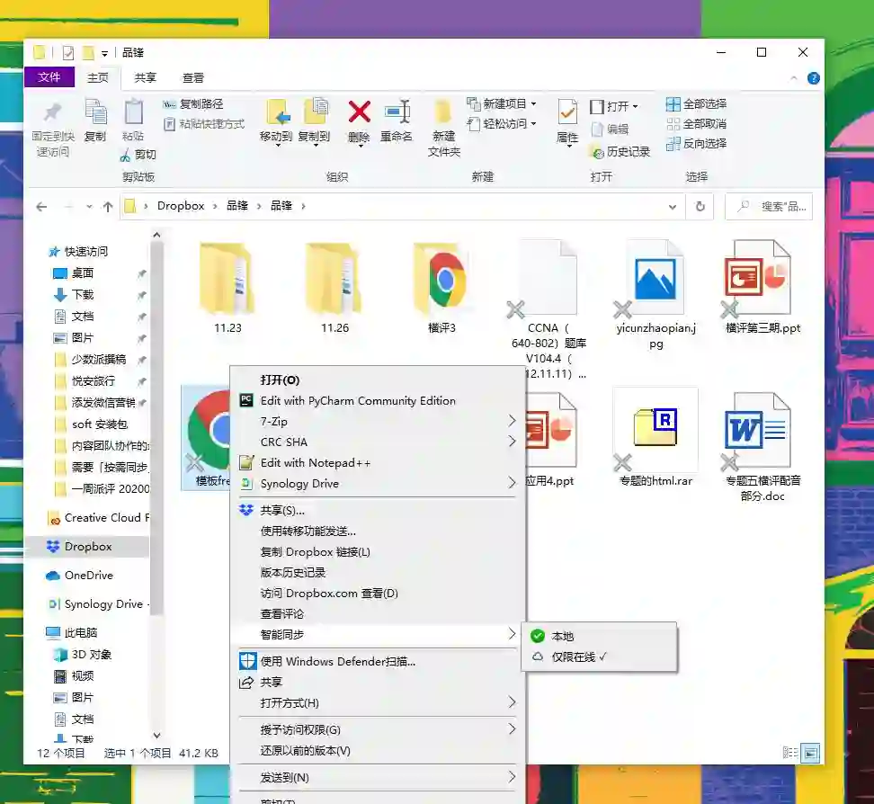 相比起前面介绍的同步网盘,Dropbox 或许是其中功能最为全面的一个——除了可以和系统资源管理器深度整合之外,还可以通过插件的形式与第三方服务进行整合,实现高效办公。Dropbox 的「智能同步」Dropbox 中也有着按需同步功能,但该功能仅限付费用户使用,名字叫做「智能同步」。虽然名称不同,但智能同步在 Windows 上的功能实现和上面提到的几款服务类似,即同步时文件夹以及文件均只有目录和列表,需要本地访问才会下载数据;并且 Dropbox 内置了自动节省硬盘空间的相关设定,几个月没有编辑的文件也会被自动清除存储并转为默认在线访问。智能同步选项因此 Dropbox 的这项智能同步其实可以在更旧的系统上使用(官方表示该功能可以在 Windows 7 上运行),不过也正是由于这种兼容性,Dropbox 在 Windows 10 上的文件状态提示与上面提到的几款略有差别,在线文件的角标会显示为一个「×」,将其下载到本地后文件图标上则不会有任何状态提示。唯一的缺点可能是 Dropbox 在国内的访问上,另外就像我们开头就说的那样,「智能同步」这项功能必须购买付费套餐才能使用。