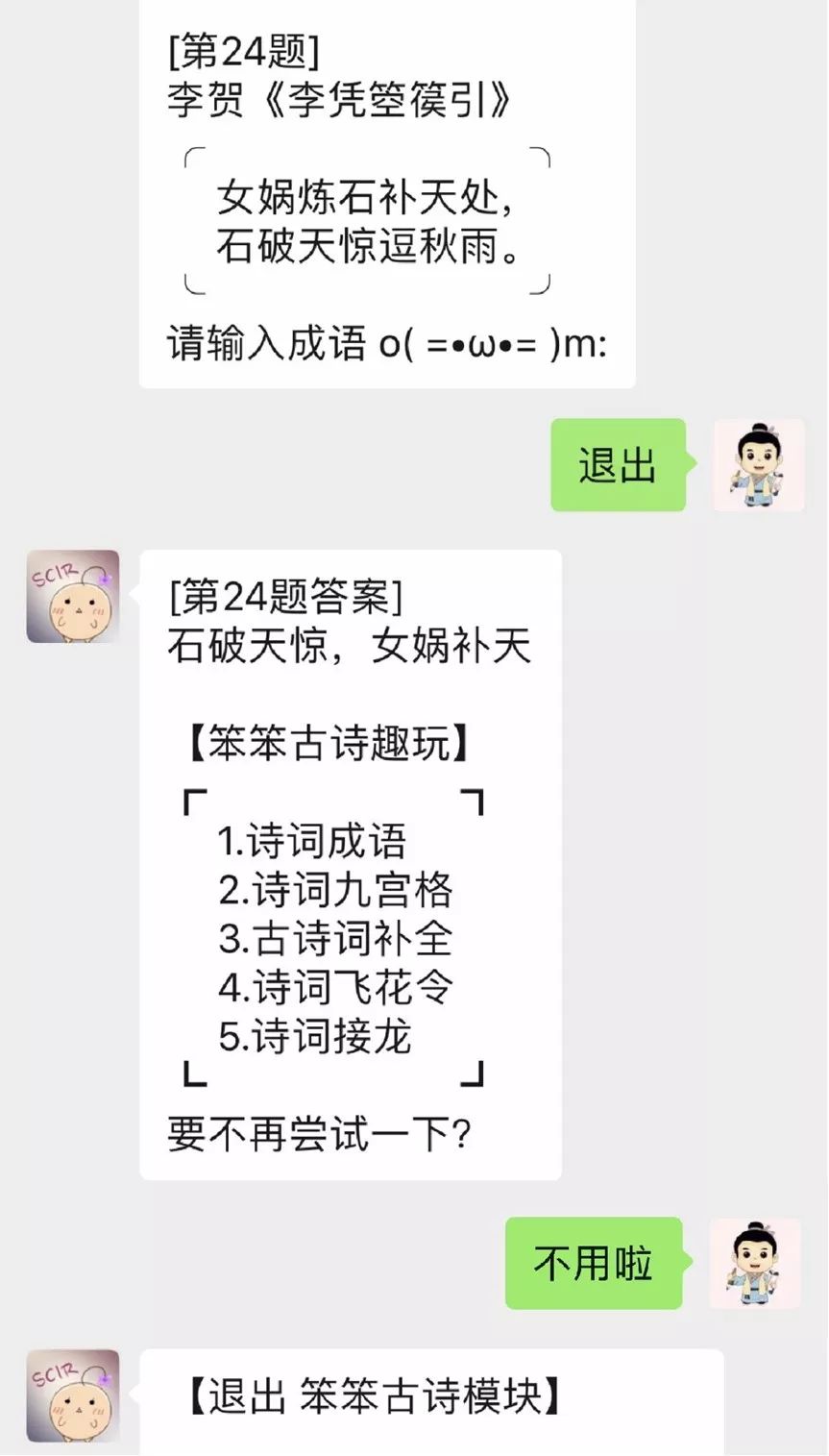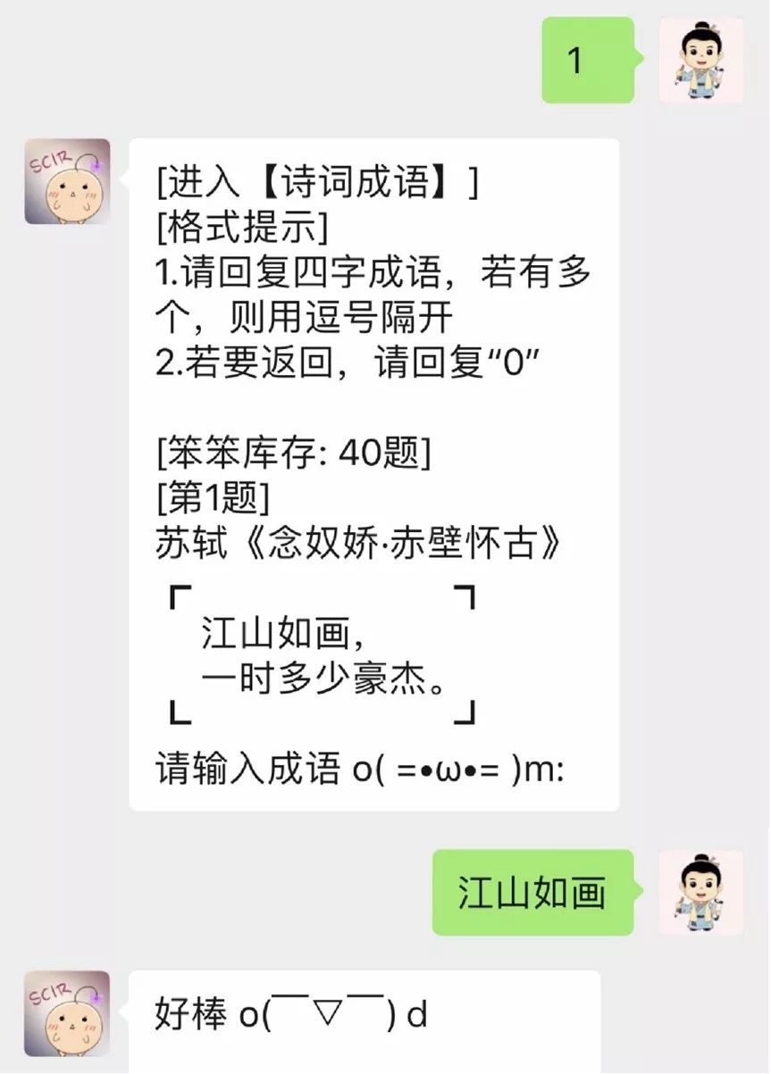最近“笨笨”对作诗很感兴趣,背了很多首古诗。现在的“笨笨”可是一个大诗人,能陪您玩诗词成语、诗词九宫格、古诗词补全、诗词飞花令、诗词接龙等五个游戏。