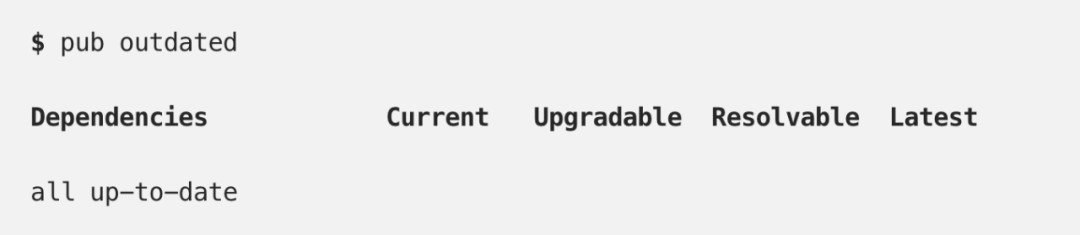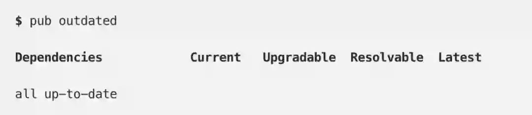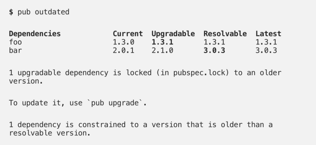 命令通过比较当前使用的版本和 pub.dev 上的最新版本,让您知晓小版本和大版本何时可用。