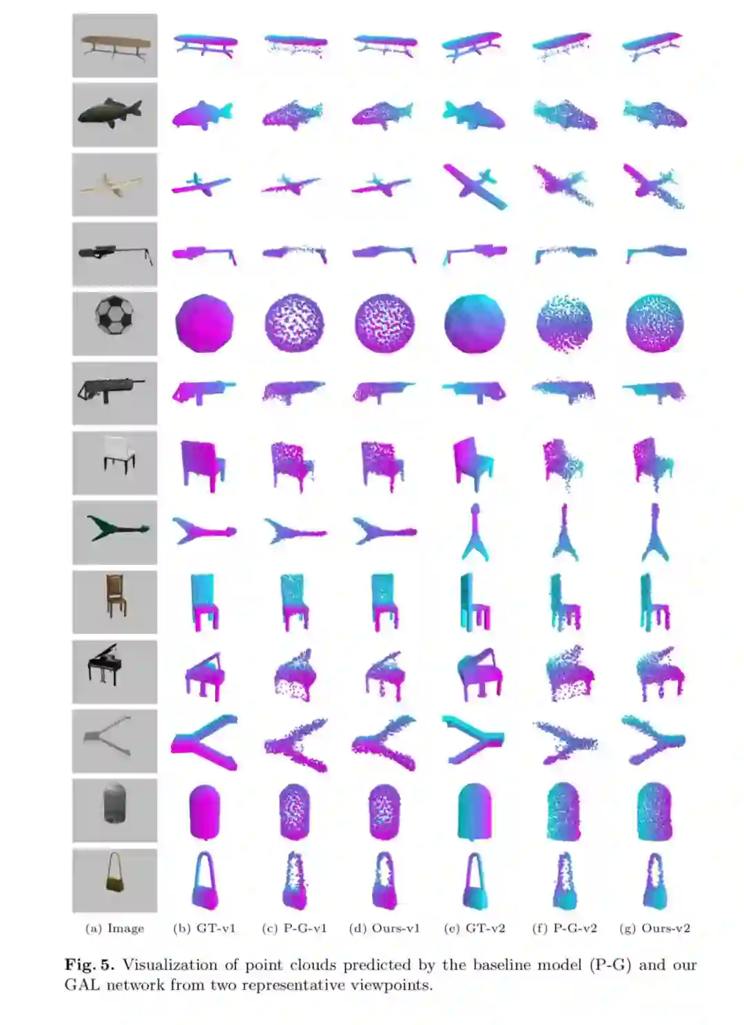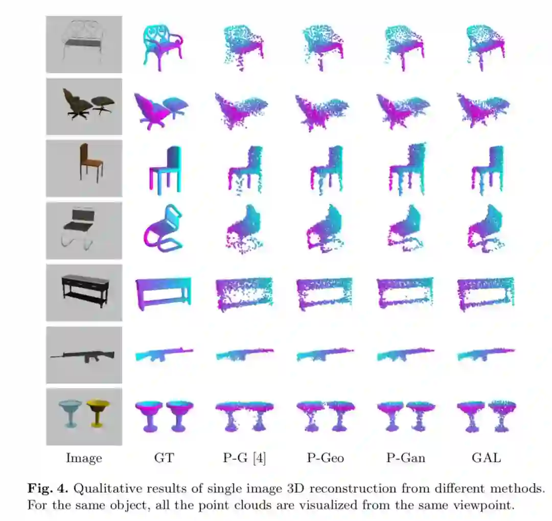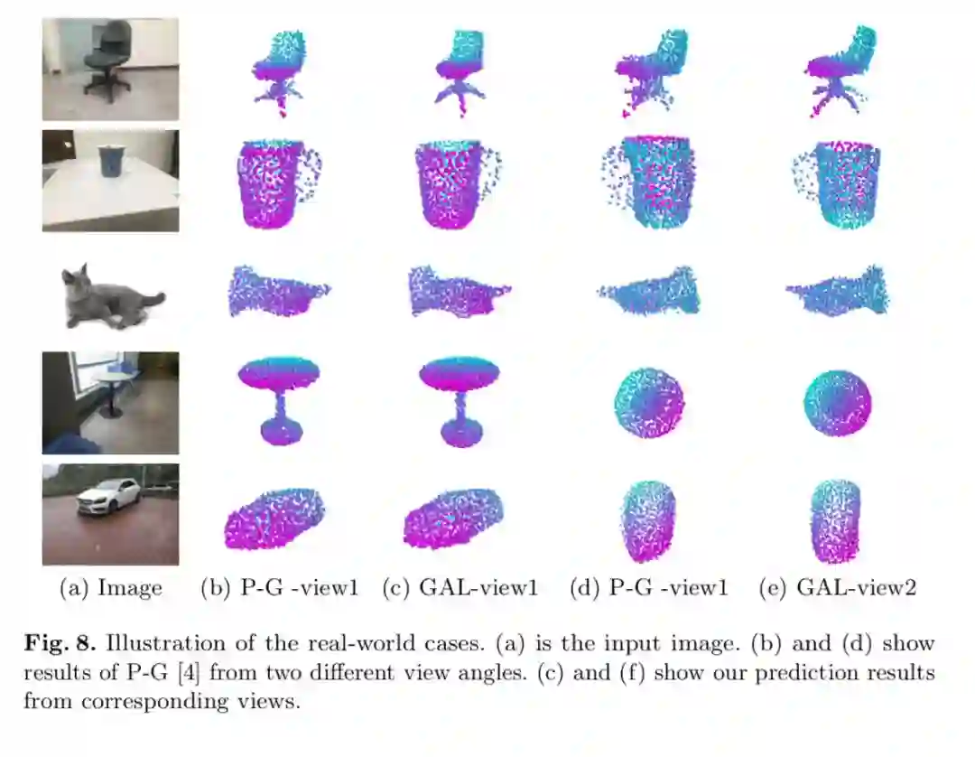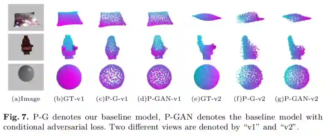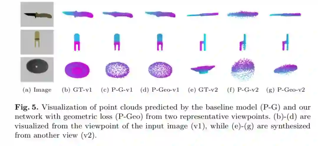 如图 1(b)(d) 所示,仅仅使用 Chamfer 距离损失,生成的点云有许多不在物体三维形状内的噪点。这是因为重建过程没有满足对整体的 3D 几何形体的限制,而仅采用了局部的点对点的限制。如图 1(c)(e) 所示,几何对抗损失使得重建的结果更加合理。