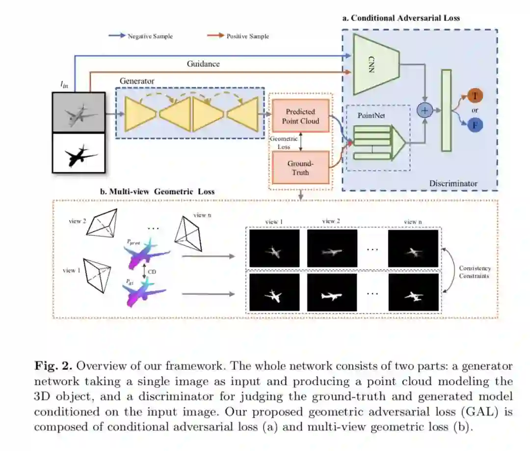在本文中我们提出了一种补充的损失函数——几何对抗损失来解决这个问题。几何对抗损失通过保持预测点云和真实点云在不同 2D 视角上的几何一致性来从整体上规范生成的点云,同时它要求生成的点云与输入图片的语义相符。