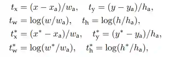 其中,x,y,w,h是Bounding Box的中心坐标和宽高;而 则分别对应Predicated BBox、Anchor BBox和Ground Truth BBox;y,w,h也同理。