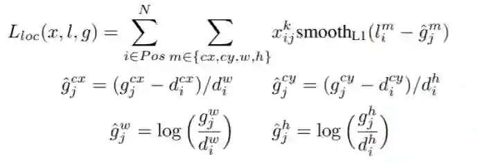 其中,cx,cy,w,h分别Bounding Box的中心坐标和宽高,g是ground truth box,d是 prior box, 是Ground Truth的Bounding Box的参数化坐标,也就是学习的目标,而l是predicted box的参数化坐标。