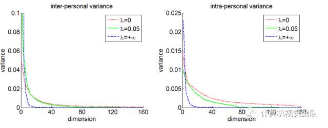能够发现,在lambda=0.05的时候,类间方差差点儿不变,类内方差下降了非常多。 这样就保证了类间区分性,而降低了类内区分性。