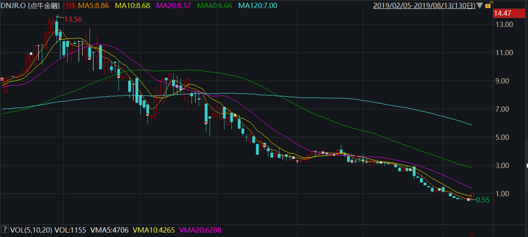 两年后,点牛金融的股价已经从今年2月时的最高13.56美元一路跌至1.02美元,暴跌近92%,市值仅剩下1500万美元(约合1.05亿元人民币)。