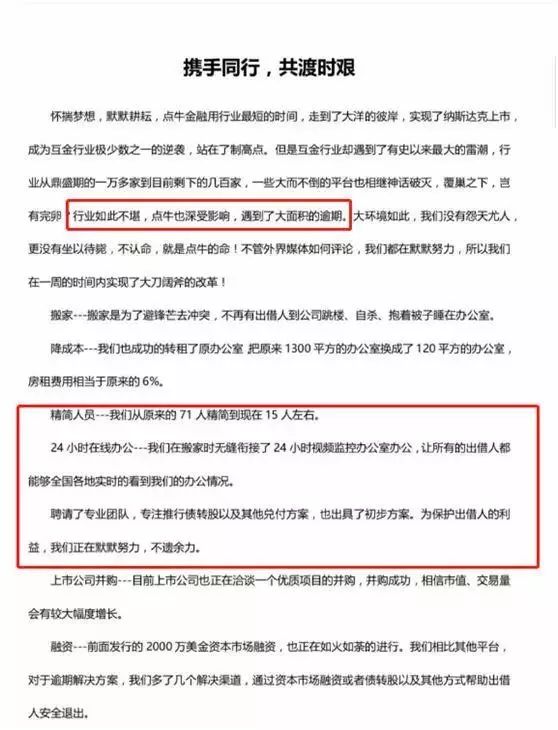 7月30日,点牛金融方面给出借人发来一份《携手共进,共渡时艰》的文件,坦言点牛金融受大环境影响,遇到了大面积的逾期,并表示已经搬家、降成本、精简人员(从71人降到15人左右)、24小时在线办公,且聘请了专业团队推行债转股以及其他兑付方案,正在进行2000万美元融资等。