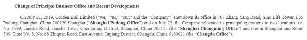 直到8月13日,点牛金融才发布公告称,公司已于7月21日关闭了位于上海浦东张杨路的办公室,公司新办公地点分为两处,分别为上海崇明区建设镇建设路、成都市锦江区东大街。
