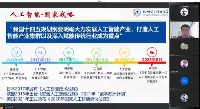 此次活动周晓飞副教授首先从人工智能的国家战略需求、浙江省战略需求、人才培养需求等方面引入发展人工智能技术的必要性。随后,周晓飞副教授介绍了达特茅斯会议、AlphaGo围棋故事介绍了人工智能的起源,并对人工智能的发展历程、定义以及人工智能的相关应用进行了介绍,让与会企业人员对人工智能有了一个全面、清晰的了解。然后,周晓飞副教授结合自身科研对相关技术及其应用进行了介绍,主要包括抠图技术、新冠肺炎图像分割技术、伪装目标检测技术以及钢铁表面缺陷检测技术等,让与会企业人员近距离感受人工智能技术对各行各业的赋能能力。接着,周晓飞副教授对人工智能的一个热门方向深度学习进行了介绍,简单讲解了深度学习的相关理论及其应用。最后,周晓飞副教授进行了总结,并对人工智能技术赋能传统企业进行了展望。