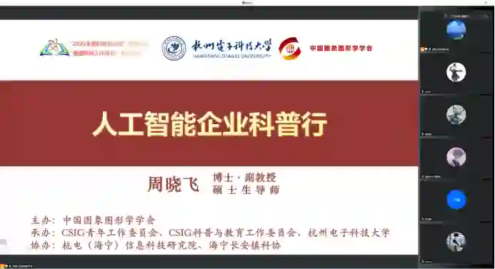 作为2022全国科普日系列活动之一的CSIG科普行于2022年10月9日在浙江省海宁市杭电(海宁)信息科技研究院举行,受限于当地疫情因素,此次科普活动在线上开展。本次活动由中国图象图形学学会主办,CSIG青年工作委员会、CSIG科普与教育工作委员会和杭州电子科技大学共同承办。本次活动邀请了杭州电子科技大学自动化学院周晓飞副教授担任讲者,以《人工智能企业科普行》为题介绍了人工智能技术的发展与应用,杭电(海宁)信息科技研究院63人以及线上直播平台的3900人参加了此次活动。